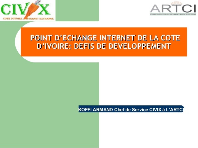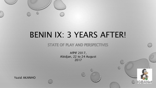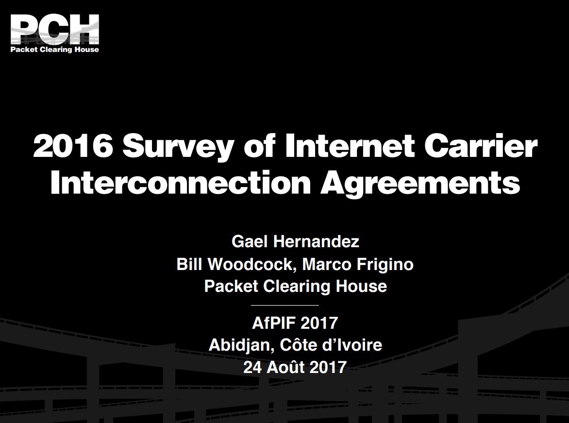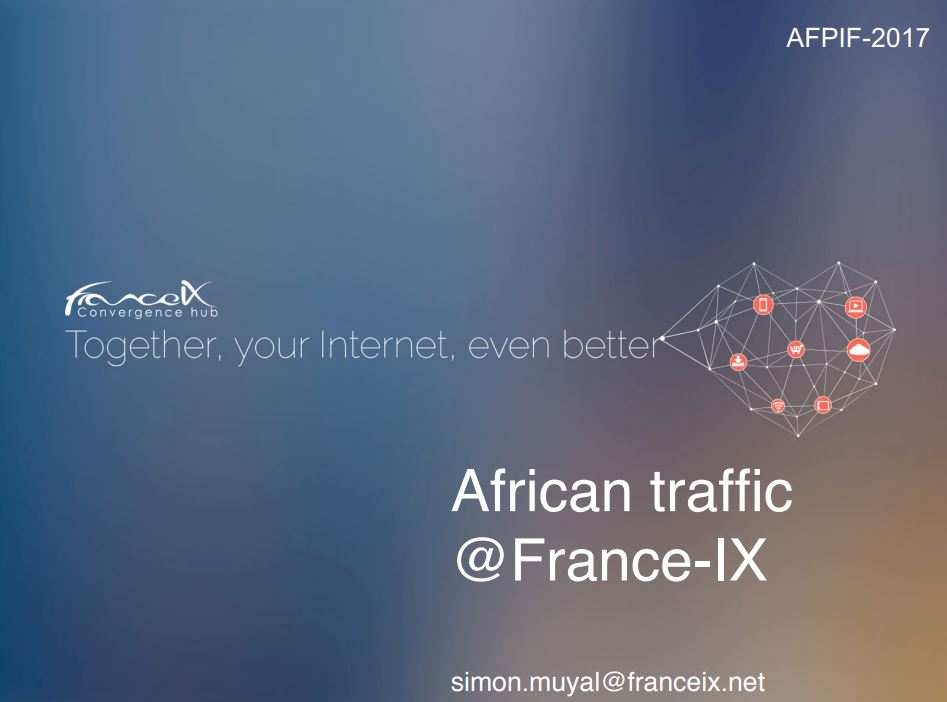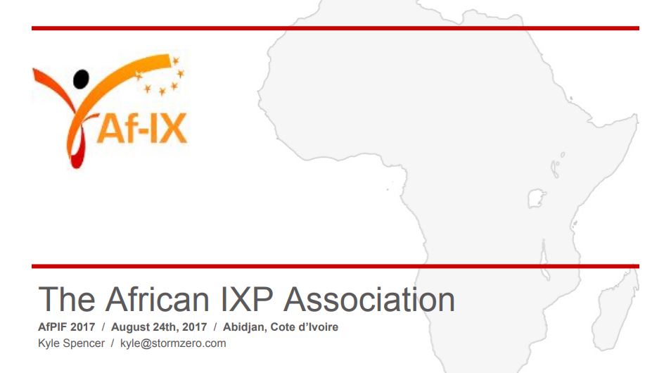 1. 2016 Survey of Internet Carrier Interconnection Agreements – Gael Hernandez (PCH) (PDF) 2. AFIX: Introduction and Regional Update – Kyle Spencer (AFIX)  (PDF)3. African traffic @FranceIX – Simon Muya (France-IX) (PDF)4. Collecting telemetry data with pmacct – Paolo Lucente (pmacct) (PDF) 5. LES DÉFIS DE LA CROISSANCE DES IXP EN AFRIQUE CENTRALE – Nico Tshintu (KINIX) (PDF)6. IXP growth challenges in Côte D’Ivoire – Koffi Armand (CIVIX) (PPT) 7. Benin IX: 3 Years After! – Yazid Akanho (Igbanet) (PPT) 8. IXP growth challenges in West Africa – Emmanuel Kwarteng (GIXP) (PPT)